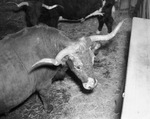 At Fort Worth's Southwestern Exposition and Fat Stock Show, North Side Coliseum, a longhorn steer, 03/1938