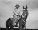 At Fort Worth Southwestern Exposition and Fat Stock Show, Lobo Jim Wilcox, pony express rider from Guymon, Oklahoma, with a pouch of mail addressed to United States states and various foreign countries. Mr. Wilcox can be seen riding his horse, he is wearing a cowboy attire, and he is carrying the pouch of US mail behind him and in front he has a lasso.