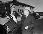 At Fort Worth Southwestern Exposition and Fat Stock Show, Mrs. Frances B. McKee from Muscatine, Iowa, reaches for popcorn from R. C. Flanery of Kansas, Illinois, both owners of show horses, 03/1938