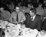 At Fort Worth Southwestern Exposition and Fat Stock Show, Cowboy Turtle Association's annual convention banquet at Blackstone Hotel; cowboy Hub Whiteman (left), bulldogger, and Jake McClure, star calf roper, 03/1938