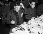 At Fort Worth Southwestern Exposition and Fat Stock Show, Cowboy Turtle Association's annual convention banquet at Blackstone Hotel; Gene Ross, another star bulldogger, unsure of what silverware to use, 03/1938
