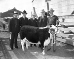At Fort Worth Southwestern Exhibition and Fat Stock Show, from left, Bud Burmester, Jack Farrell, Van Zandt Jarvis, Frank M. Newsom, and Gordon Grote with Pretty Boy II, grand champion steer purchased by the Worth Hotel, 03/1938