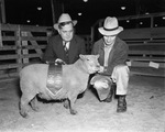 At Fort Worth Southwestern Exhibition and Fat Stock Show, Henry Love, manager of Hotel Texas (left), and Alex McKenzie of Oklahoma A&M with champion fat wether lamb, 03/1938