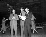 At Fort Worth Southwestern Exhibition and Fat Stock Show, square dance competitions at the Rainbeau Garden; judges are, from left, S.C. Simon (Lubbock), J. D. Parmer (Fort Worth), and J. L. Watson (Fort Worth), 03/1938