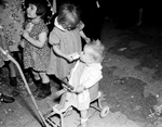 At Fort Worth Southwestern Exhibition and Fat Stock Show, on Children's Day, Patricia Sowers shares ice cream with her sister Shirley Ann (from Indian Oaks), 03/1938. There is another little girl standing next to Patricia. Shirley is seating on a push around cart.