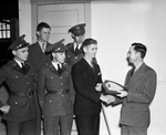 At Fort Worth Southwestern Exhibition and Fat Stock Show, North Texas Agricultural College livestock judging team winners; from left, Buster Gentry, Clifford Powell, L.I. Samuels, Rufus L. Peoples; in back, Preston Pratt and James Bond, 03/1938. One of the man is shaking hands with another man.