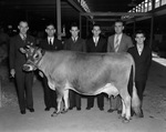 At Fort Worth Southwestern Exhibition and Fat Stock Show, winning dairy judging team, from left, A.L. Darnell, Texas A&M professor; S.E. Carpenter, A. D. Hilburn, A. H. Nance, E.J. Botard, and J.T. Hobin, 03/1938. There is a cow and behind her there are the five men standing.