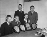 At Fort Worth Southwestern Exposition and Fat Stock Show, Texas Tech dairy judging team, from left in back, M. G. Pederson, Arch G. Lamb; sitting, Van Scheid, Charles Gillham, Clayburn Harrell, 03/1938. Three of the men are seating at a table showing their trophies. The other two men are standing behind.