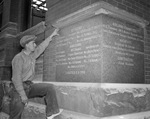 John Beckley, one of members of the wrecking crew for the old Carnegie Library, looks at the huge corner stone of the building that's being demolished.