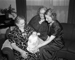 Four generations: Mrs. Wirt Kessler (visiting from Ohio) holds great-grandchild Sandra Louise Sutton; Mrs. Roger E. Sutton (right) is daughter of Mrs. A.S. Swank (center) of Ohio, 04/1938. They are in a living room seating in a couch.