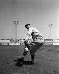 Salvador Gliatto, 140-pound curve ball specialist, is Dallas Steers starting pitcher in opening game of Texas League season against Fort Worth Cats, 04/1938. The image shows Gliatto throwing a pitch.