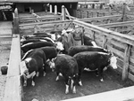 Amon G. Carter Sr. (left) and Gordon Grote with the carload of champion steers which Carter bought for the Star-Telegram. Carter is wearing a suit and tie with a hat. Mr. Grote is wearing a long sleeve shirt with the letter "M" printed on it, pants and a hat. In the background is a view of the different animal pens in the barn and some unidentified men standing at a distance.