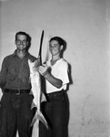 B. L. Pruitt, left, and L. J. Patterson caught six-pound catfish of the rare spoonbill variety in Trinity River near the Paddock Viaduct, 06/1938