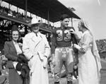 Mr. and Mrs. Amon Carter (left) with Sammy Baugh, formerly of TCU who plays for Washington Redskins, in Washington, D. C. for "Texas Day" at the football game; Helen Elizabeth Litz puts pin on Baugh's jersey.
