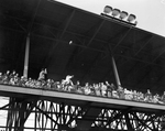 Amon Carter throws out first ball from stands at the football game between Washington Redskins and New York Giants in Washington, D. C., on "Texas Day." Clipping reads: "It was 'Texas Day' in Washington, D. C. when the Redskins met the New York Giants in a game of professional football on October 9, 1938. In pregame ceremonies, the Red Cross drive in Washington was helped along. Mr. Amon G. Carter of Fort Worth is seen throwing out the first ball from the second deck box to start the game.