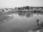 Four men gathered at Shady Oak Farm Lake. Three men are standing around a fishing net and one man is standing in a canoe in the middle of the lake. There are grasses, trees, and a bridge where people are standing and watching in the background. The men are wearing overalls and long sleeve shirts with hats.