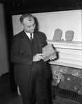 Dr. Rex Z. Howard and an archeological item (fragment of "safety line" from ancient roadway on Tescingo Hill, Mexico) used to illustrate his talk on "Unseen Mexico" to the Texas Library Department of the Woman's Club, 02/1939