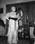 Mrs. S.B. Edwards, president of Mothers Service Club of Fort Worth and general chairman of a Colonial tea at home of Mrs. Sula R. Gardner; dressed in period costume for the tea, 02/1939