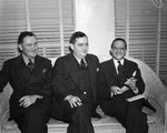 Wholesale Grocers' convention in Fort Worth; from left, P.C. Murphy of Houston; W.S. Dorset of Sherman; and T.P. Davis of Austin, director of the Grocers' Association, 02/1939. They three are seating in a sofa and behind them, there are two windows with the blinds closed.