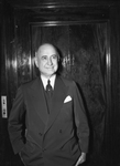 Portrait photograph of Amon G. Carter Sr. He is standing in front of a closed door, wearing a suit and tie with a handkerchief in his jacket breast pocket. He is smiling.