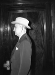 Portrait photograph of Amon G. Carter Sr. in profile view, facing left. He is standing in front of a closed door, wearing a suit and a hat.