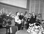 Dedication of Fort Worth's new City Hall building; Firemen's Fiddle Band play in a council chamber, 03/1939