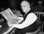 William Monnig looks at old newspaper announcement of the formal opening of his new retail store, Monnig's, 14 years ago (in 1925) in downtown Fort Worth, 03/1939