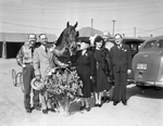 Retirement of "Belle Sarita," a horse owned by Mrs. James North. Standing around the horse, left to right, are Paul Whiteman, Albert J. Beasley, Mrs. James North, Mrs. Paul Whiteman, Amon Carter and Jimmy North. There is a floral wreath around the horse's neck and a bouquet of flowers on the ground. Mrs. North is wearing a polka-dot blouse and a skirt, Mrs. Whiteman is wearing a dress and fur coat, and all the men are wearing suits. In the background are cars, electric poles some buildings.