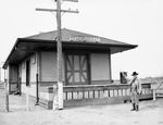Amon G. Carter Sr. standing in front of a railroad station at Belcherville, Texas. Carter is wearing a cowboy hat and cowboy boots, and has a gun holster on his belt. He is holding up a pistol in his right hand. In the background are electric poles and some houses.