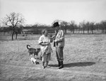 Amon Giles Carter standing outdoors with an unidentified woman and a dog.
