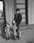 A woman is seen with her children in front of their house. Cars are seen to the right of the photo.