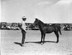 Cowboy holds horse on lead rope before spectators sitting beside cars in background, 6666 Ranch, 04/1939