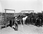 Cowboy on foot with rope herding horses into a corral on the 6666 Ranch, 04/1939