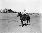 Cowboy on horseback in front of ranch house on the 6666 Ranch, 04/1939