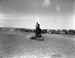 Cowboy racing a horse before spectators sitting beside cars on the 6666 Ranch, 04/1939