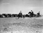 Cowboys on horseback running barrel race on 666 Ranch, 04/1939