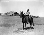 Cowboy on horseback in front of ranch house on the 6666 Ranch, 04/1939