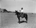 Cowboy on horseback in front of ranch house on the 6666 Ranch, 04/1939