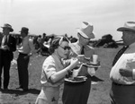 People eating from paper plates in open field on the 6666 Ranch, 04/1939
