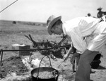 Man stirring pot of beans over open fire on the 6666 Ranch, 04/1939