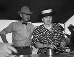 Man and woman, both wearing hats, eating under a tent on the 6666 Ranch, 04/1939