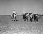 Four cowboys, one on horseback, with horses on the 6666 Ranch, 04/1939