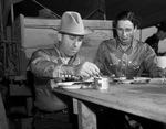 Railroad Commissioner Saddler and State Representative Alvin Allison (Levelland) eat breakfast at the Pitchfork Wagon, Spur, Texas, rodeo. Mr. Allison can be seen wearing a cowboy hat and holding a spoon in his hands and there is an unidentified man sitting next to him.