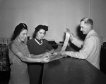 World's Fair goodwill pilgrimage of Texas Chamber of Commerce; Clara Bloore (left) and Eva Bloore buy tickets from C.W. Leftwich, Missouri-Kansas-Texas Railway, 06/1939