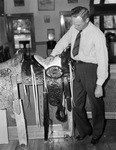 Henry G. Andrews, looking at one of the six finely tooled saddles to be given as special awards at the Stamford Cowboy Reunion, 06/1939