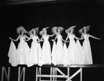 Opening number at Casa Manana; showgirls, from left, Helen Whiting, Helen Curtis, Mary Kirksey, Wynona Hawthorne, Marzelle Van Hoosier, Frances Brashear. The ladies can be seen wearing white evening gowns and hats, they are all on stage.
