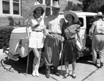 At the Stamford Cowboy Reunion and Rodeo, from left, Mary Paige Covey (performer from Casa Manana), President W. L. Pier of Fort Worth Chamber of Commerce, and Margaret Hall (Fort Worth), 07/02-03/1939. They can be seen standing in front of a car, Miss Covey is wearing a skirt, a short sleeve blouse tucked in, a belt, a scarf around her neck and a cowboy hat. Mr. Pier is wearing long pants a short sleeve shirt, and a hat. Miss Hall is wearing a polka dot dress, a hat, high heels, and she is holding her purse. They are really close to each other and smiling.