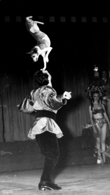 Man with dog balancing on head, Billy Rose's Jumbo building, Fort Worth Frontier Centennial, 1936