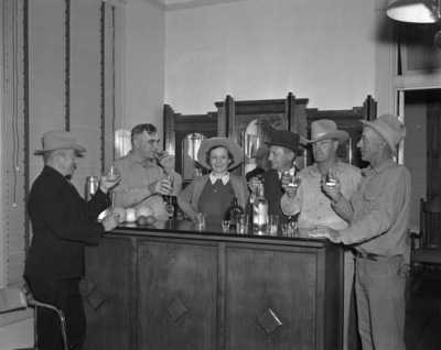 Bob Bond Roundup; Paul Whiteman, H. A. "Dutch" Schaffer, et al.; 5 men and a woman behind bar with drinks, 1936