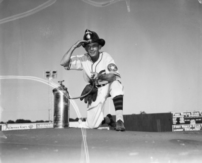 Jackie Reid, pitcher for Fort Worth Cats, in fireman's uniform, 1936